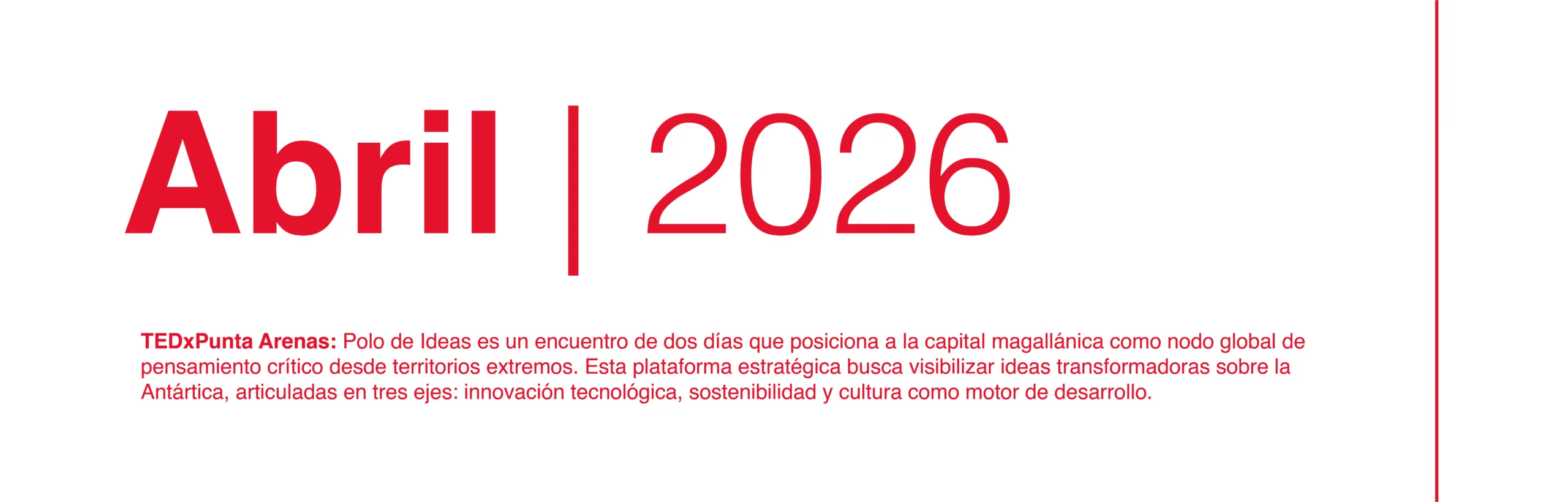 Si tienes una historia personal vinculada a la Antártica —o eres familiar de alguno de sus protagonistas— te invitamos a postular y compartir tu relato. La organización de TEDxPunta Arenas seleccionará un testimonio de la comunidad que se convertirá en una charla estilo TED, presentada en el escenario del evento.