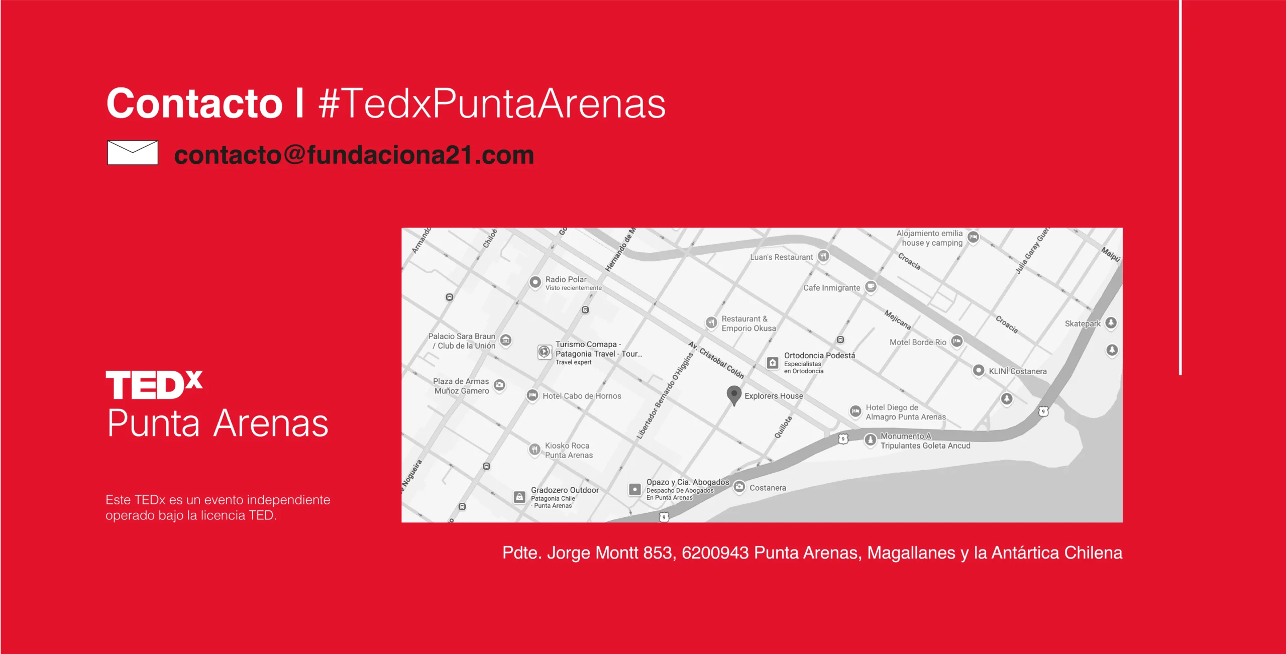 TEDxPuntaArenas es impulsado por Fundación Antártica21, una organización sin fines de lucro con sede en la Región de Magallanes y Antártica Chilena. Su misión es promover la educación, la cultura y la ciencia vinculadas a la Antártica, conectando el conocimiento con la comunidad local.